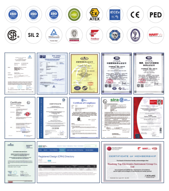 Since its establishment nearly 30 years ago, DDTOP Group has been committed to “Highly Respect for Safety” as its mission, and has strictly control over the quality of production, to ensure to provide customers and the site with safer products, DDTOP products have won a number of qualifications at home and abroad. We have passed ISO9001:2015 quality management system, ISO14001:2004 environmental management system, Q/SY1002.1-2013 health, safety and environment management system (HSE), ATEX/IECEx/CSA explosion-proof quality management system, CE pressure vessel quality management system and functional safety management system certification. The instrument products have been certified by a number of international authoritative certification, including ATEX explosion-proof certification, IECEx explosion-proof certification, functional safety certification, CSA explosion-proof certification of the US-Canada double standard, PED, CRN pressure vessel certification, EMC electromagnetic compatibility certification, HART/FF certification, etc.